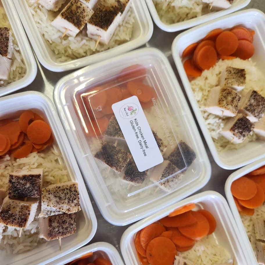 Roast chicken breast on teeny skewers with basmati rice and steamed organic carrots.
