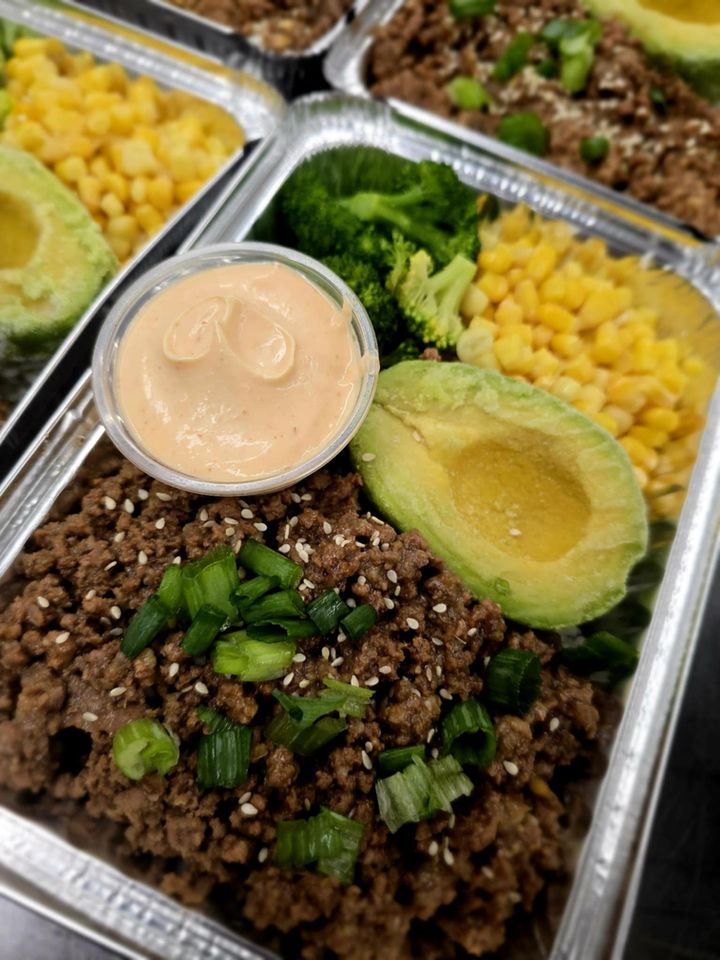 Seasoned local ground beef with avocado and organic vegetables on basmati rice with a side of spicy mayo.