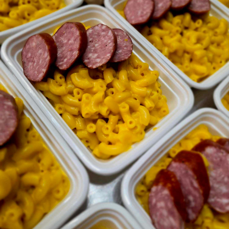 Homestyle macaroni and cheese, made with three kinds of cheese, with slices of Double Smoked Farmer’s Sausage.